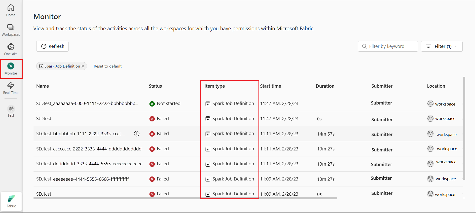 To view all the Spark applications related to a Spark job definition, go to the Monitor pane. Sort or filter the Item Type column to view all the run activities associated with the Spark job definitions.