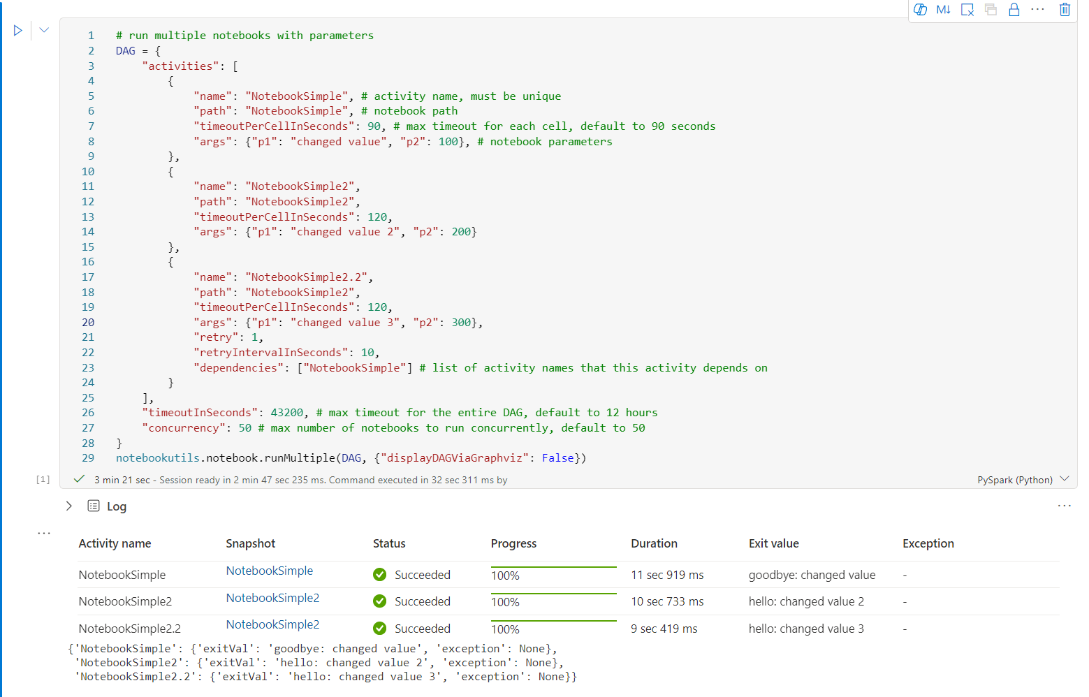 runMultiple(DAG: Any): Map[String, MsNotebookRunResult] -> Runs multiple notebooks concurrently with support for dependency relationships.
