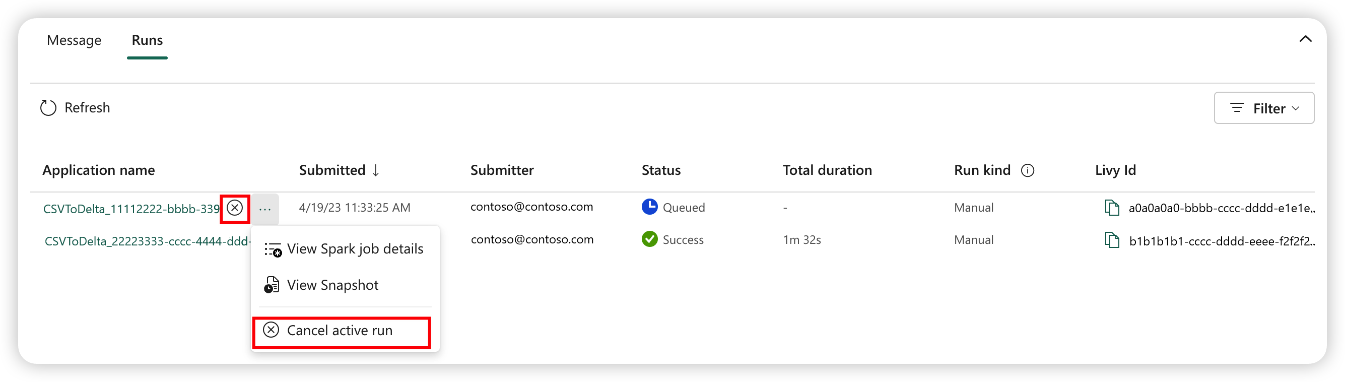 Once the job is submitted, you can cancel the job by selecting Cancel active run from the Spark job definition item in the job list.