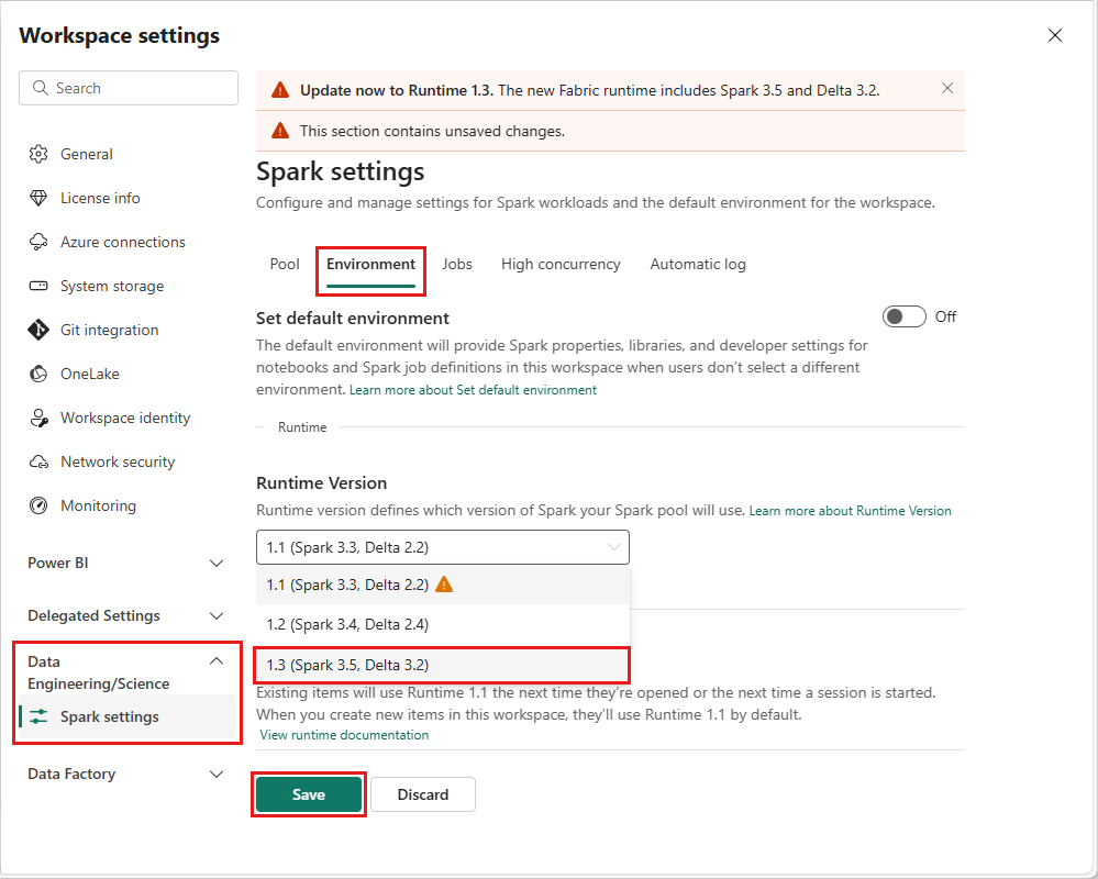 To change the runtime version at the workspace level, go to Workspace Settings > Data Engineering/Science > Spark settings. From the Environment tab, select your desired runtime version from the available options. Select Save to confirm your selection.