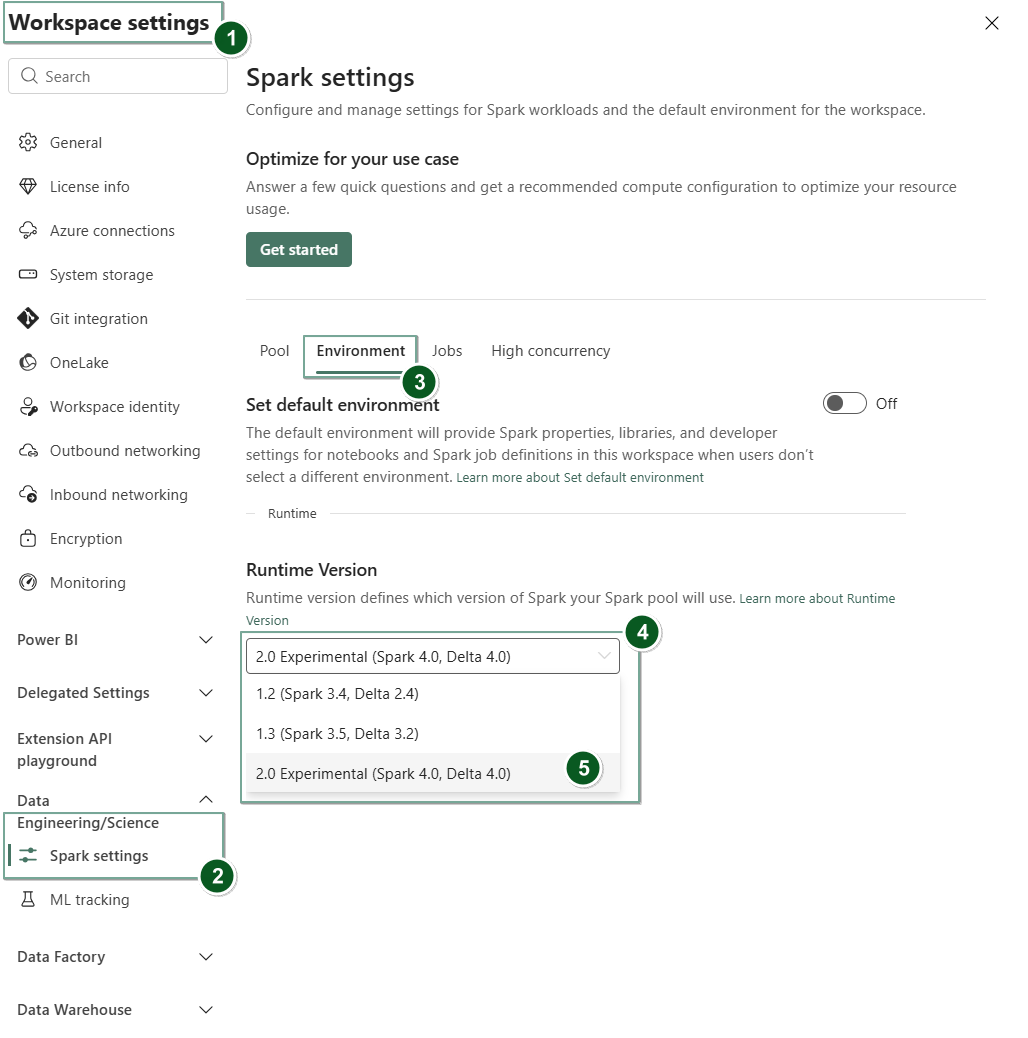 You can enable Runtime 2.0 at either the workspace level or the environment item level. Use the workspace setting to apply Runtime 2.0 as the default for all Spark workloads in your workspace. Alternatively, create an Environment item with Runtime 2.0 to use with specific notebooks or Spark job definitions, which overrides the workspace default.