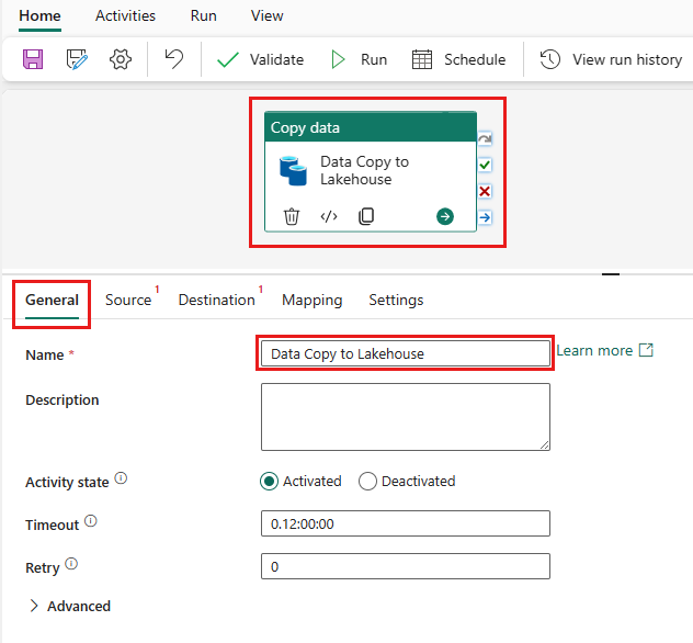 Select the newly added copy data activity from the canvas. Activity properties appear in a pane below the canvas (you might need to expand the pane upwards by dragging the top edge). From the General tab in the properties pane, type Data Copy to Lakehouse in the Name field. Leave remaining properties to their default values.
