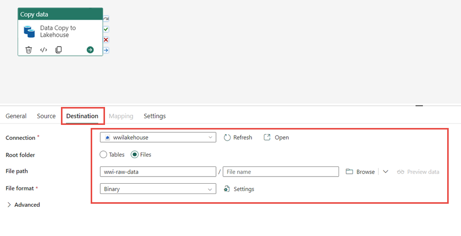 Directory name (second text box): WideWorldImportersDW/parquetRecursively Checked File format Binary From the Destination tab of the selected copy data activity, specify the following properties: