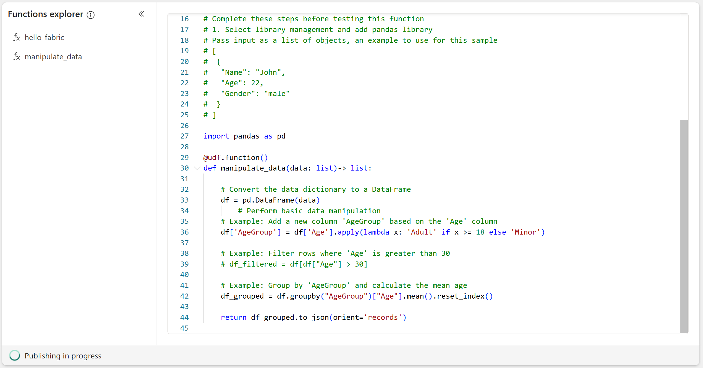 hello_fabricPython function template. The Functions explorer shows all the functions that are published and ready to be invoked.Once the