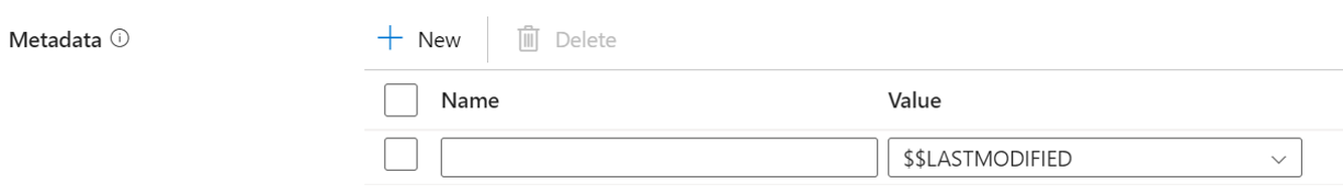 | Additional columns | Additional data columns to store source files' relative path or static value. Expression is supported for the latter. | • Name • Value |