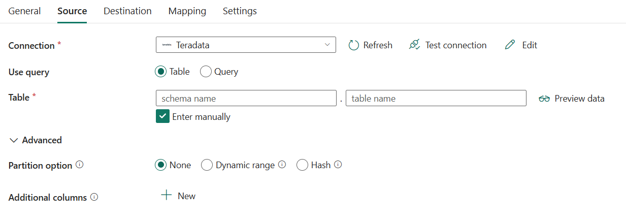 None), the degree of parallelism to concurrently load data from Teradata is controlled by the Degree of copy parallelism in the copy activity settings tab.None: Choose this setting to not use a partition.