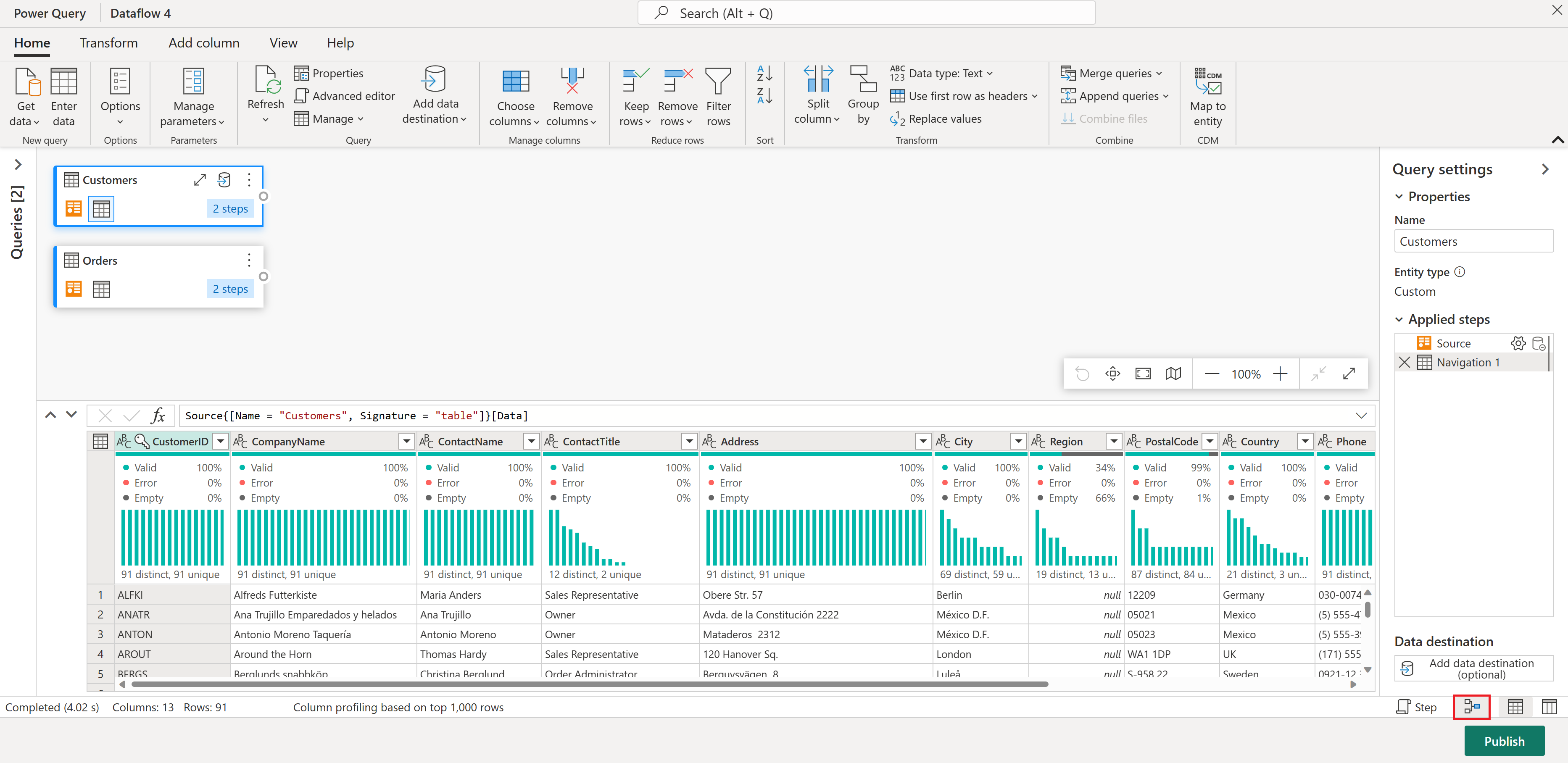 Now there's a new query with all columns from the Customers table and one column with nested data from the Orders table.