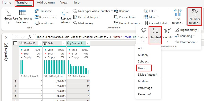 Select the Discount column and then select the Transform tab on the menu. Select Number column, and then select Standard numeric transformations from the submenu, and choose Divide.