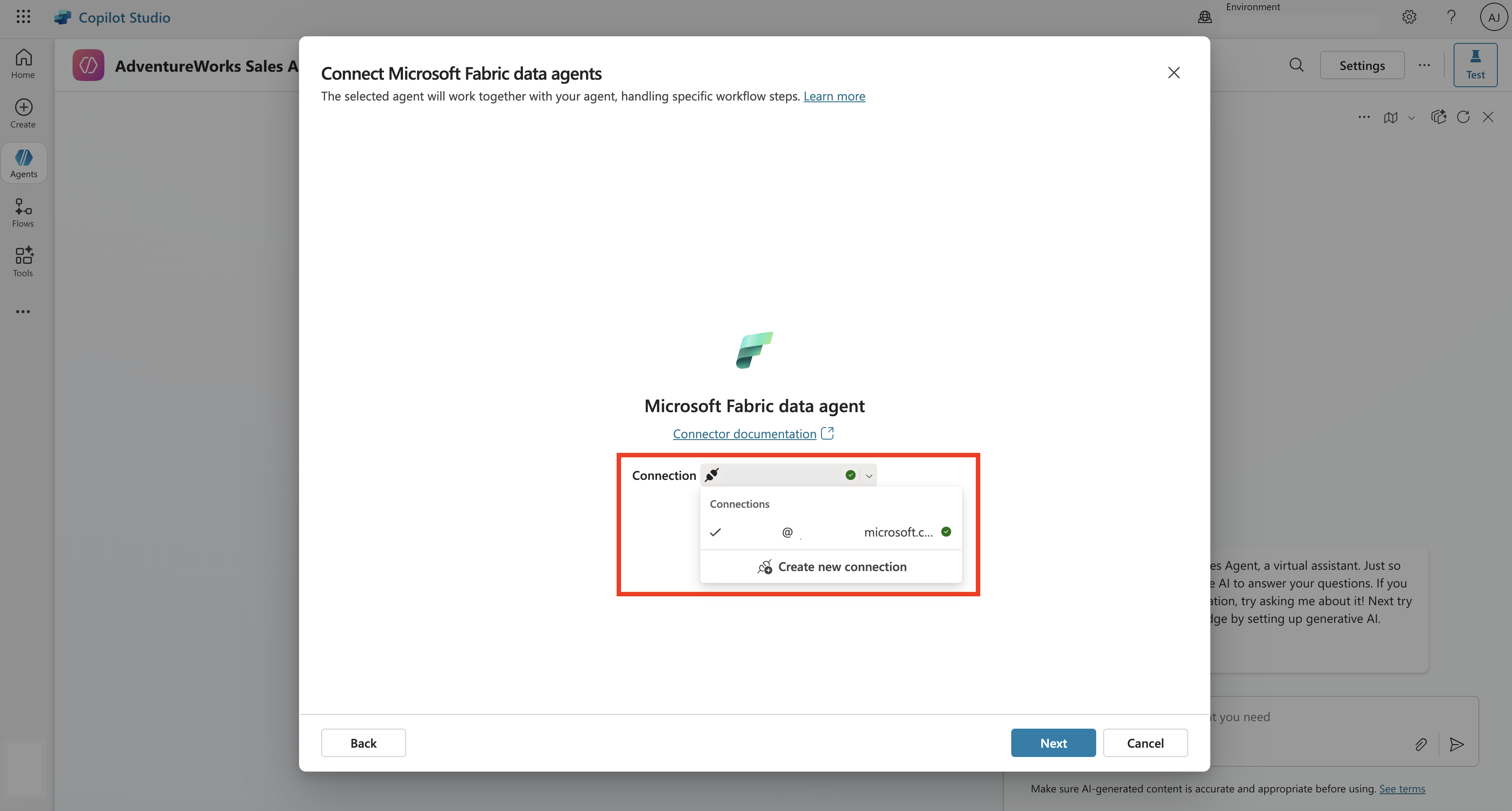 If there's already a connection between Microsoft Fabric and the custom AI agent, you can select Next and move to next step. Otherwise, select the dropdown and select Create new connection to establish a connection between Microsoft Fabric and Copilot Studio.