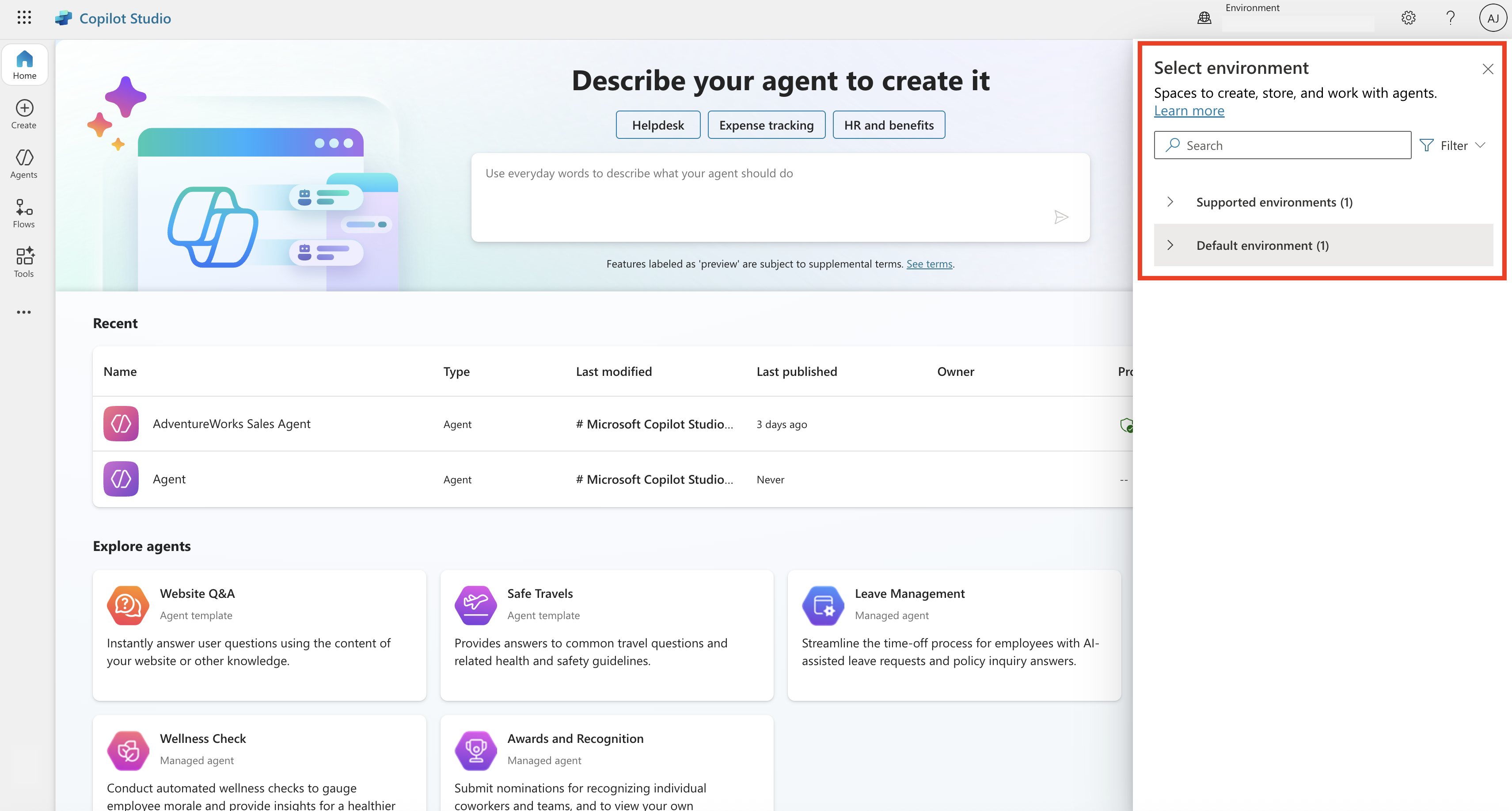 Once you select desired environment, on the left pane, select Create, then select + New agent to start building your custom AI agent. If you already have a custom AI agent, you can skip steps 2 and 3.