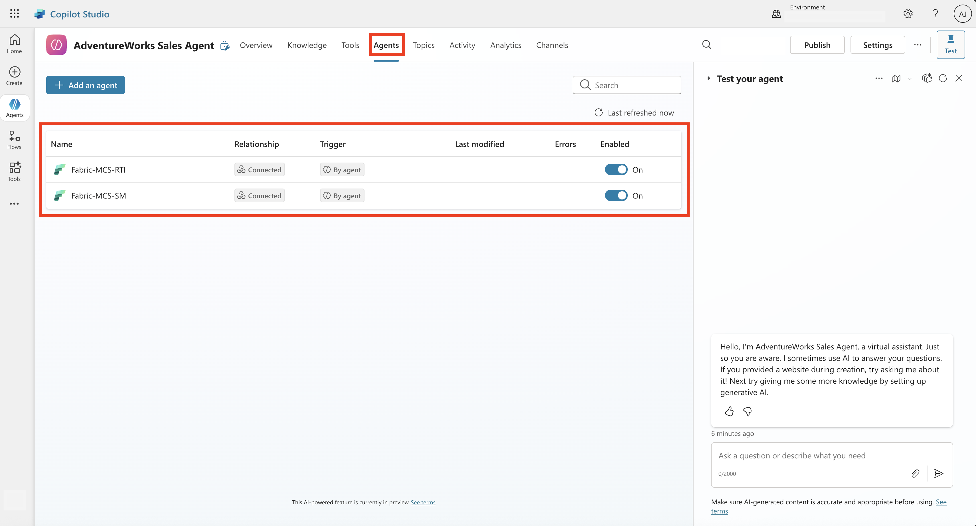 Once done, navigate back to the Agents from the top pane and you should see the Fabric data agent among the agents that are connected to the custom AI agent.
