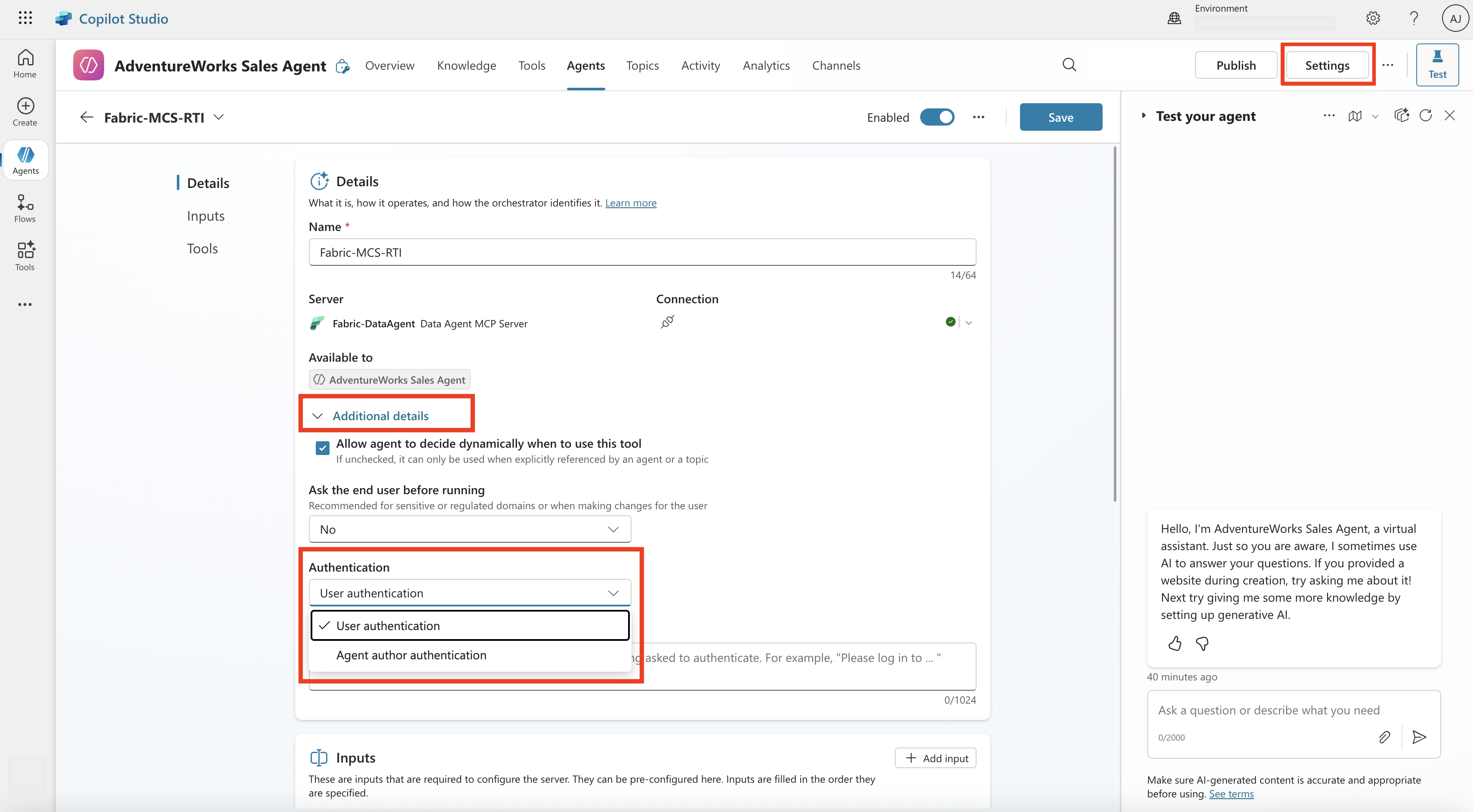 Select the connected Fabric data agent. Under additional details, you can optionally decide the authentication of the Fabric data agent to be the User authentication or Agent author authentication. If you select User authentication as the authentication, you need to ensure that users have access to the Fabric data agent and its underlying data sources.
