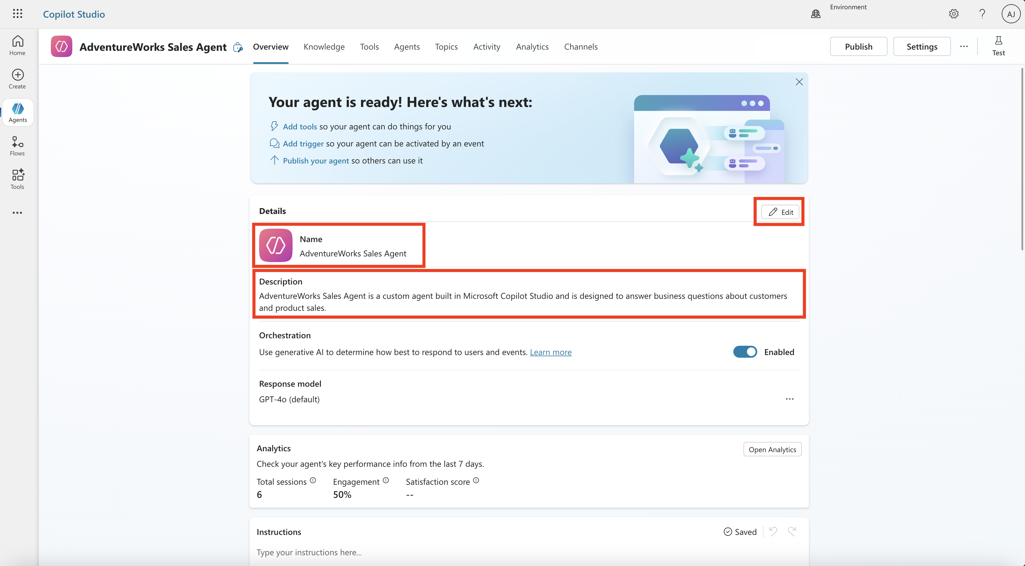 Configure your agent by giving it a Name and Description that describes its purpose and role. Make sure to save your changes.