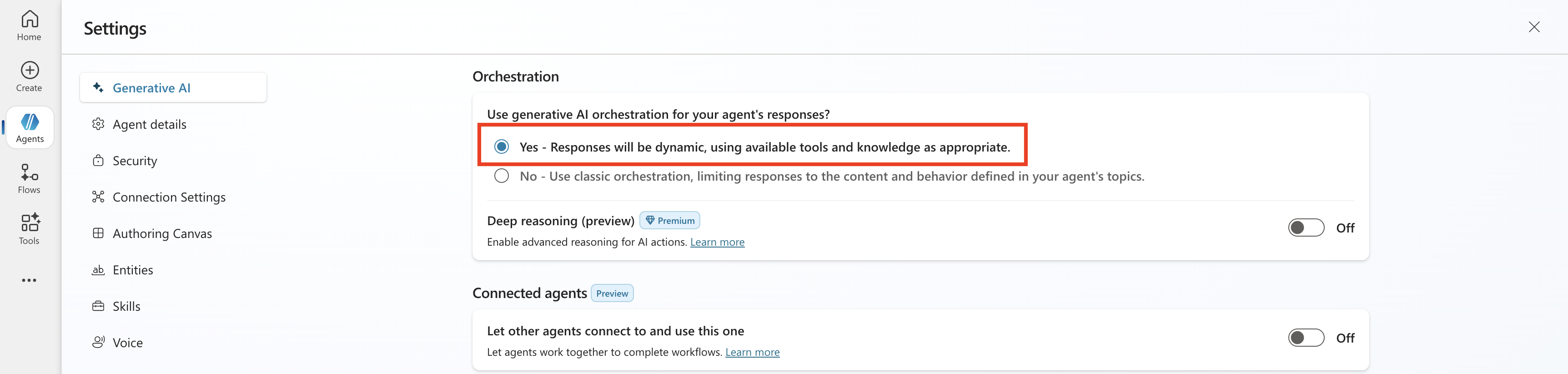 Ensure that you have enabled generative AI orchestration. To do this, select Settings that is located on the top of the chat pane and under Orchestration, select the first one.