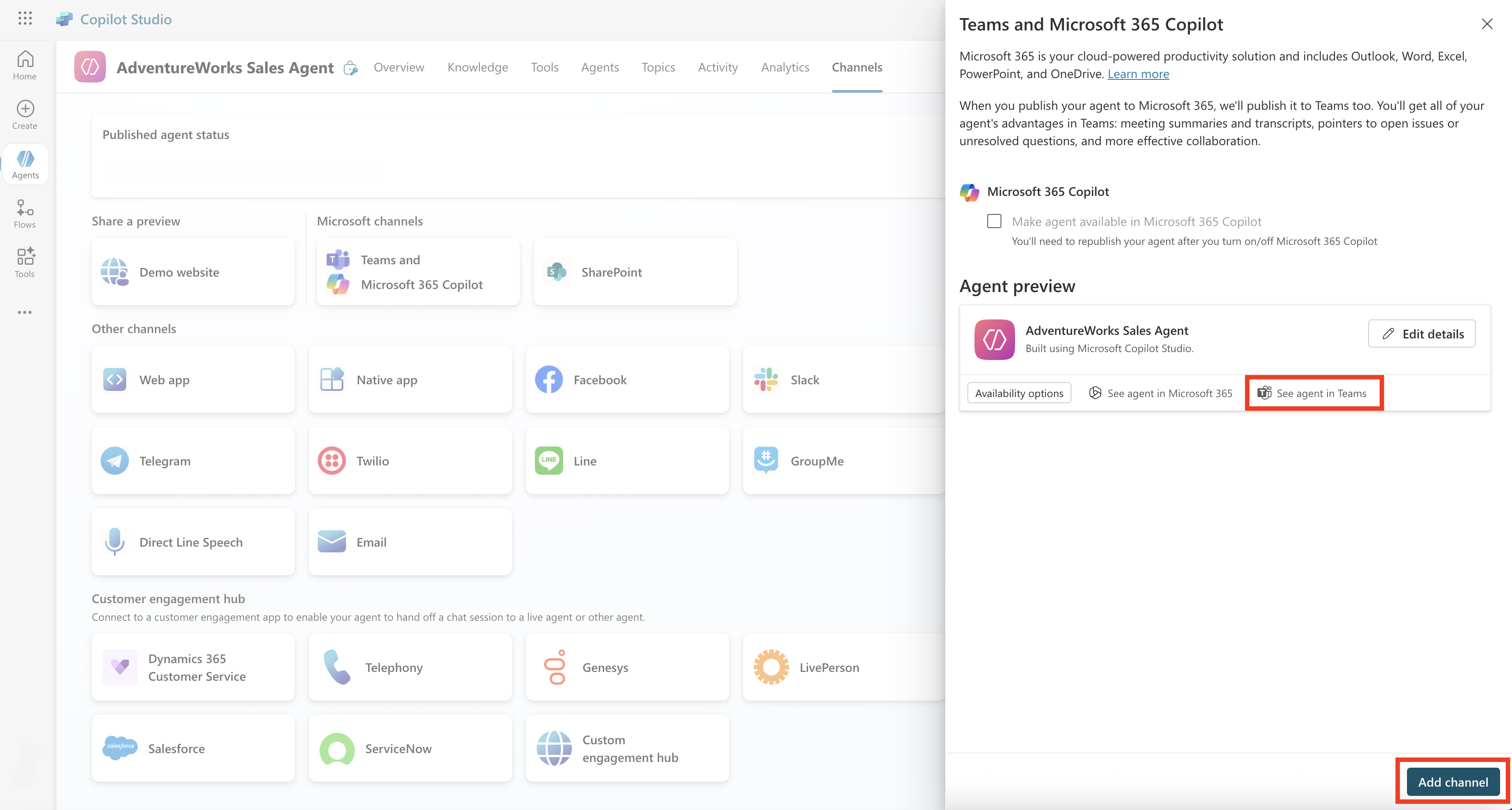 To publish to Teams, select Teams and Microsoft 365 Copilot from the list of channels. This opens the window on left. Select Add channel to enable this channel. Once done, the See agent in Teams are active. You can select it, which prompts you to open Microsoft Teams.
