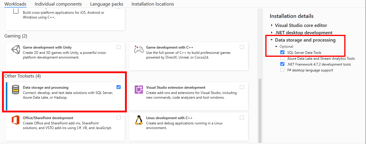In the Workloads tab, in the Other Toolsets section, select Data storage and processing.