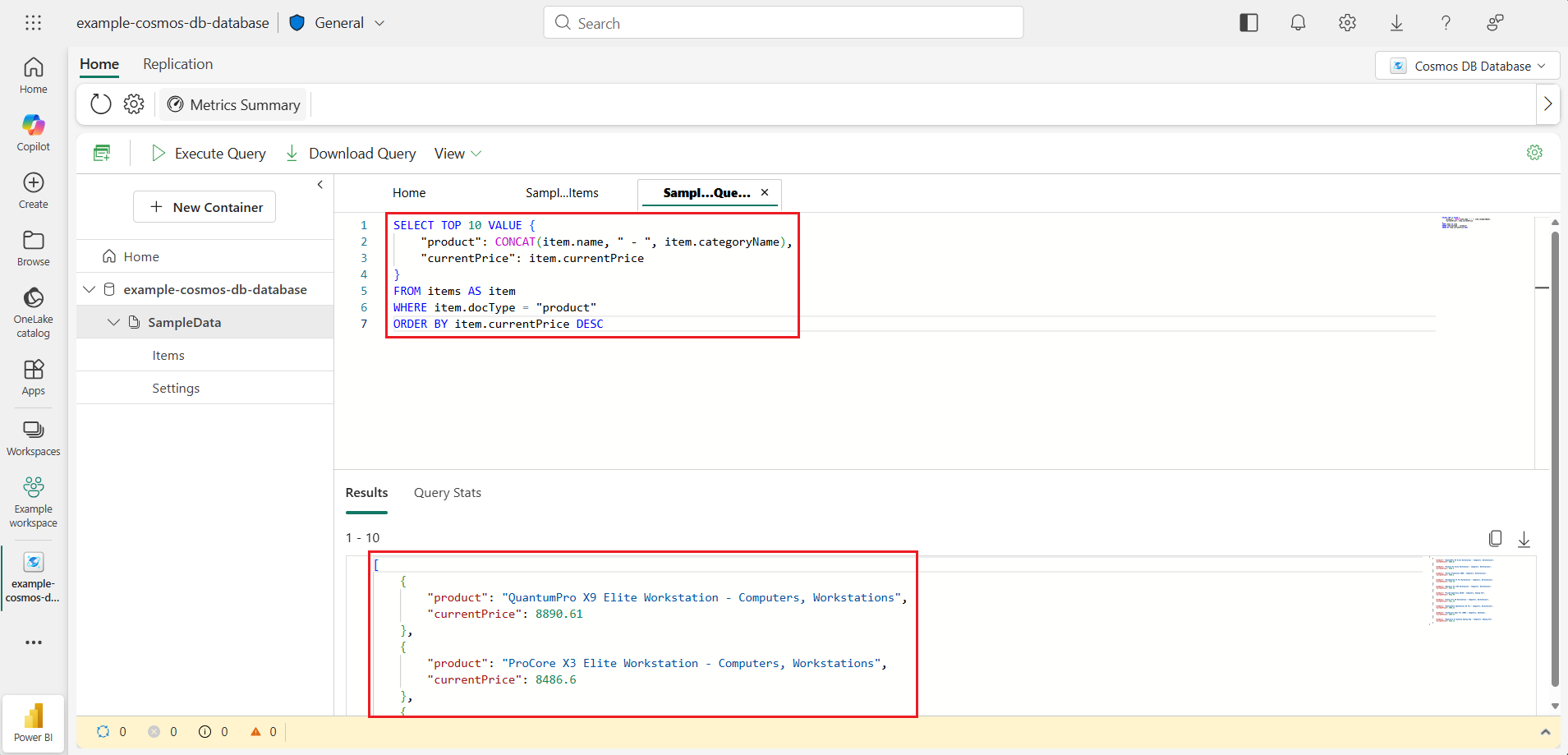 SELECT TOP 10 VALUE { "product": CONCAT(item.name, " - ", item.categoryName), "currentPrice": item.currentPrice } FROM items AS item WHERE item.docType = "product" ORDER BY item.currentPrice DESCObserve the results of the query in the query editor.