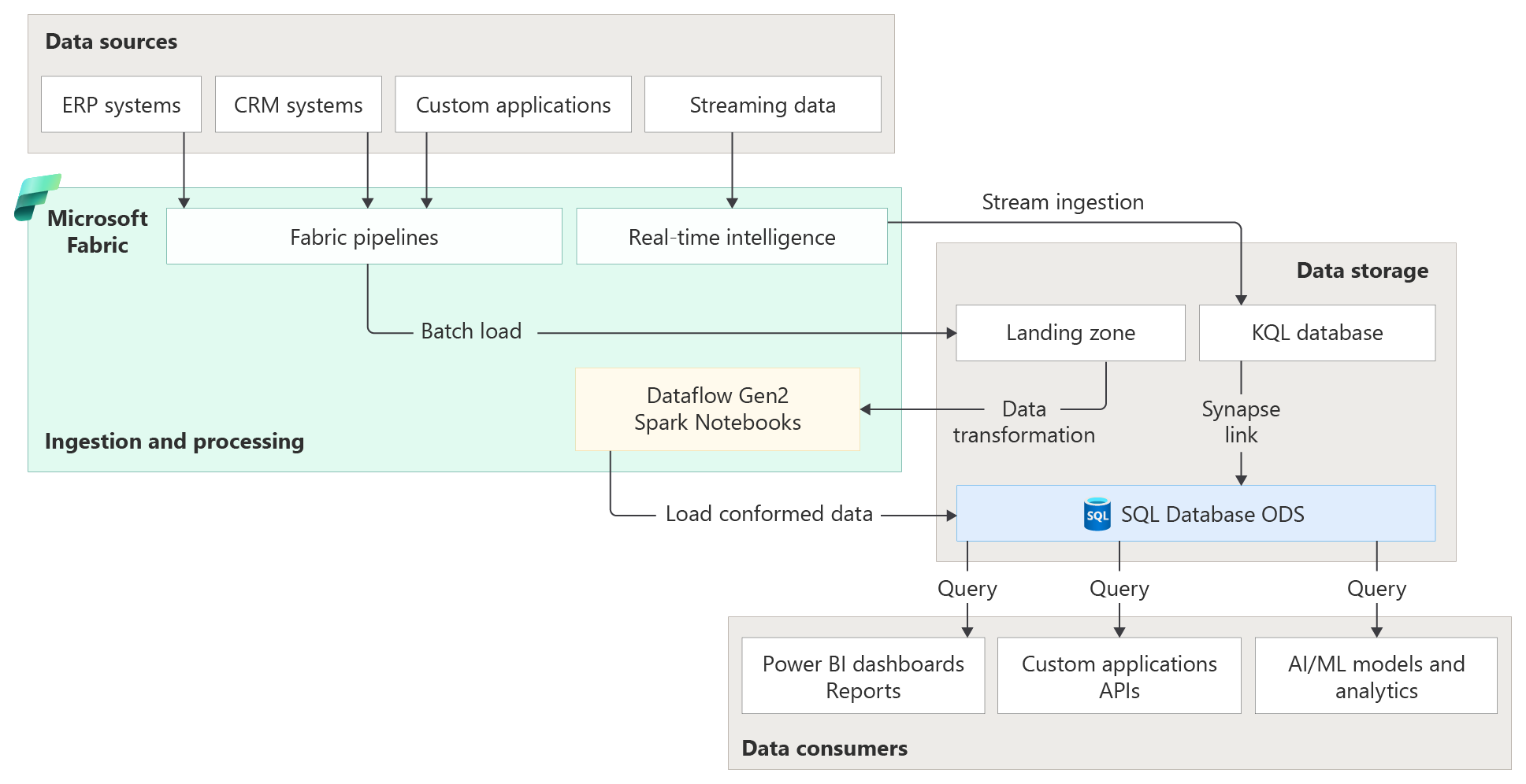 - Batch and incremental loads are typically orchestrated through Fabric Data Pipelines using change data capture-enabled connectors, with watermarking and retry logic to ensure consistency.