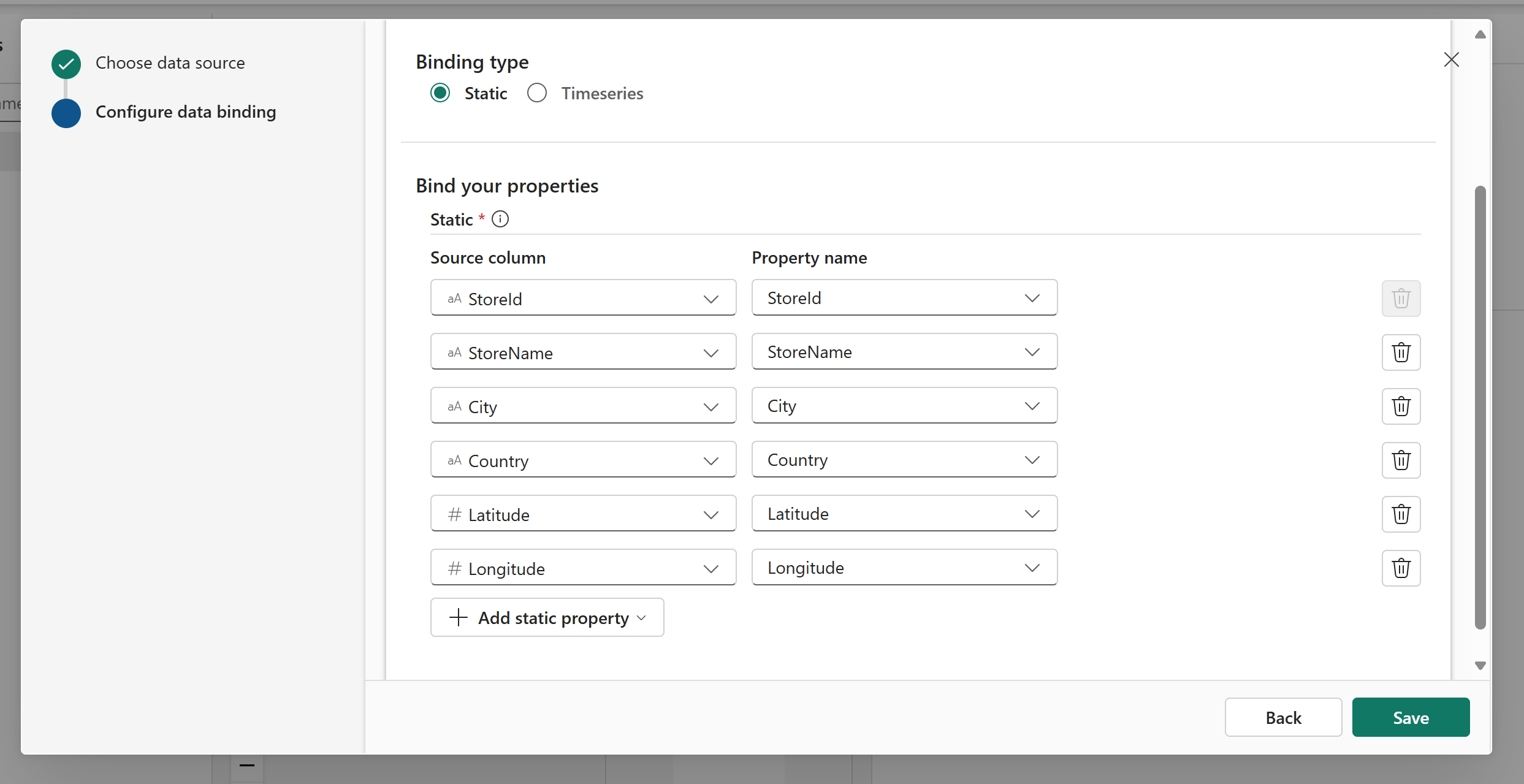In the Static section, bind source columns to the properties that are defined as the entity type key. If you need to update the key, you can add more static data now by selecting + Add static property.