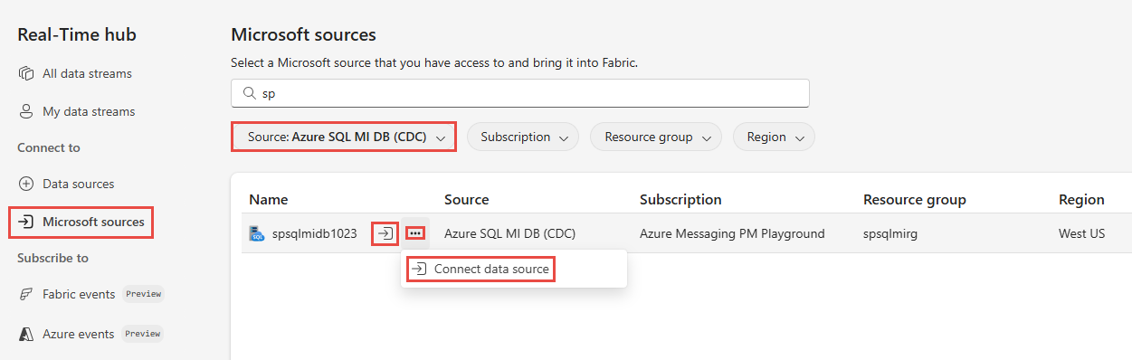 6. Now, move the mouse over the name of the Azure SQL Managed Instance DB CDC source that you want to connect to Real-Time hub in the list of databases, and select the Connect button, or select ... (ellipsis), and then select the Connect button.