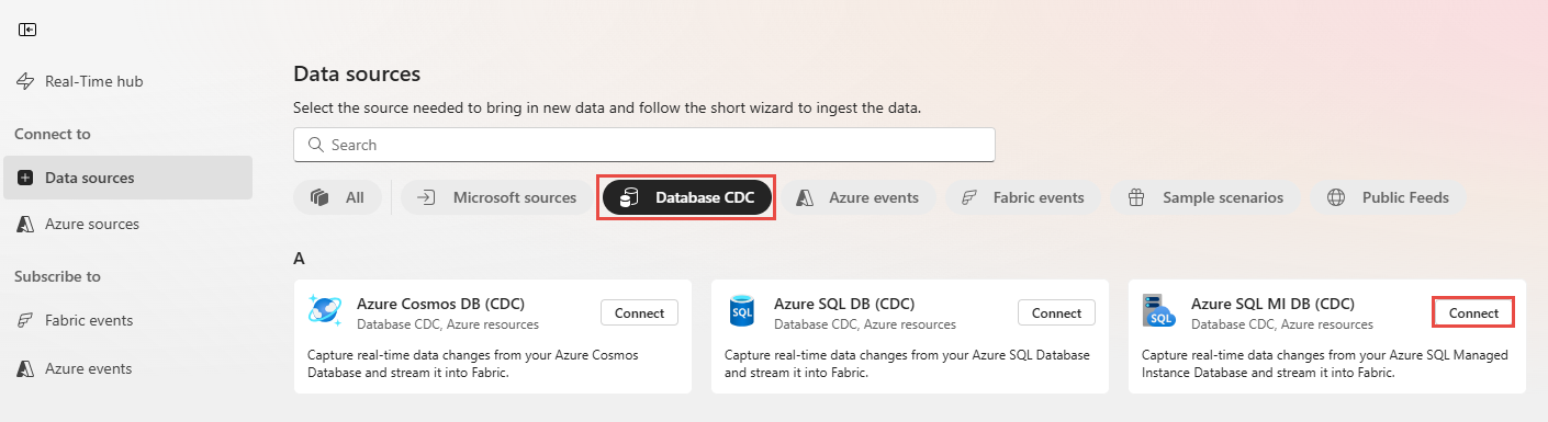 1. On the Data sources page, select Database CDC category at the top, and then select Connect on the Azure SQL MI DB (CDC) tile.