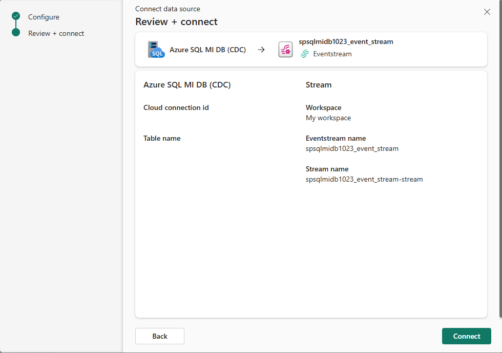 1. On the Review + connect page, if you select Open eventstream, the wizard opens the eventstream that it created for you with the selected Azure SQL MI DB CDC as a source. To close the wizard, select Close or X* in the top-right corner of the page.