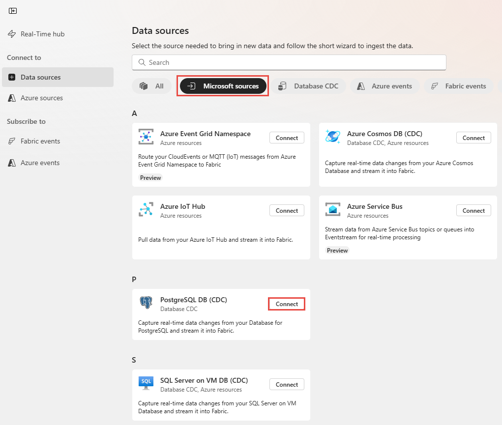 1. On the Data sources page, select Microsoft sources category at the top, and then select Connect on the Azure DB for PostgreSQL (CDC) tile.