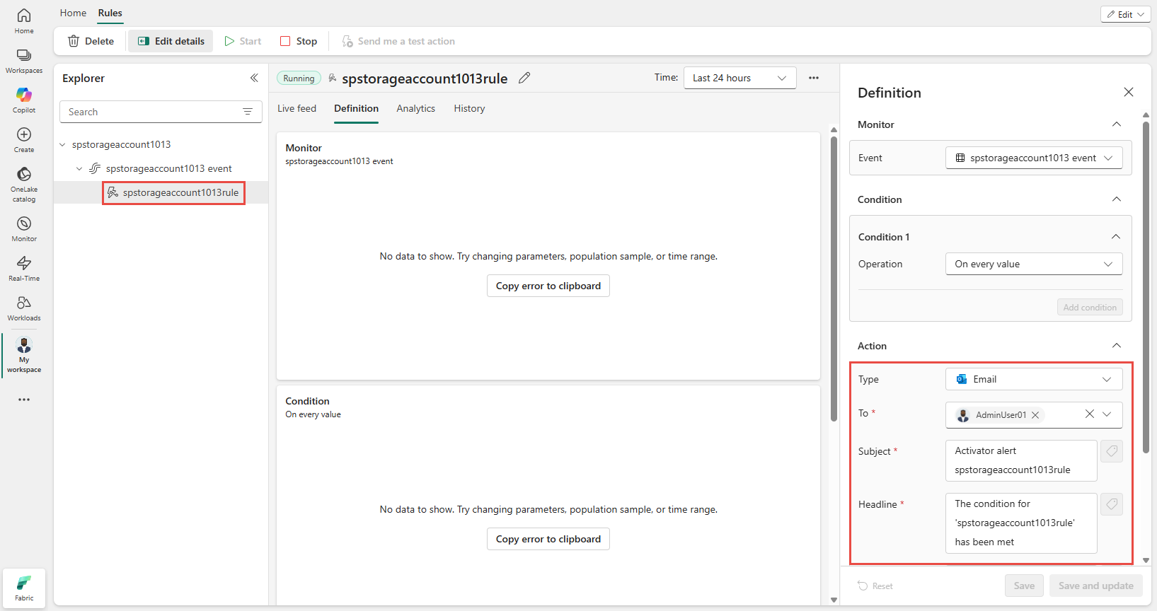 Similarly, you can move the mouse over the Activator item, and select Open. You see the Activator item in the Fabric Activator editor user interface. You can update the rule in this user interface. For example, update the subject, headline, or change the action from email to Teams message.