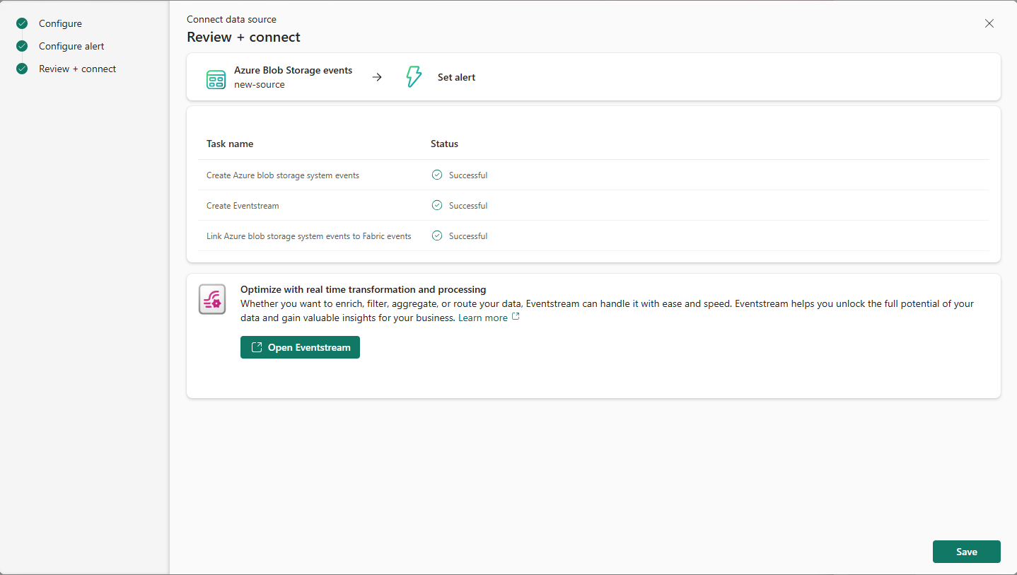 Once it's successful, select Save at the bottom of the wizard. You can also select Open Eventstream to view the eventstream that's created by the wizard.
