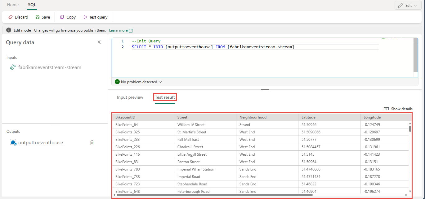 9. On the ribbon, use the Test query command to validate the transformation logic. Test query results appear on the Test result tab.