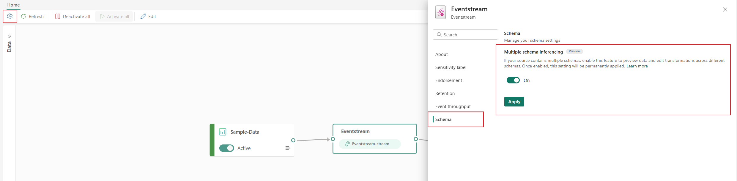To use multiple schema inferencing, you need to enable the feature in your eventstream. You can enable it in both new and existing eventstreams.
