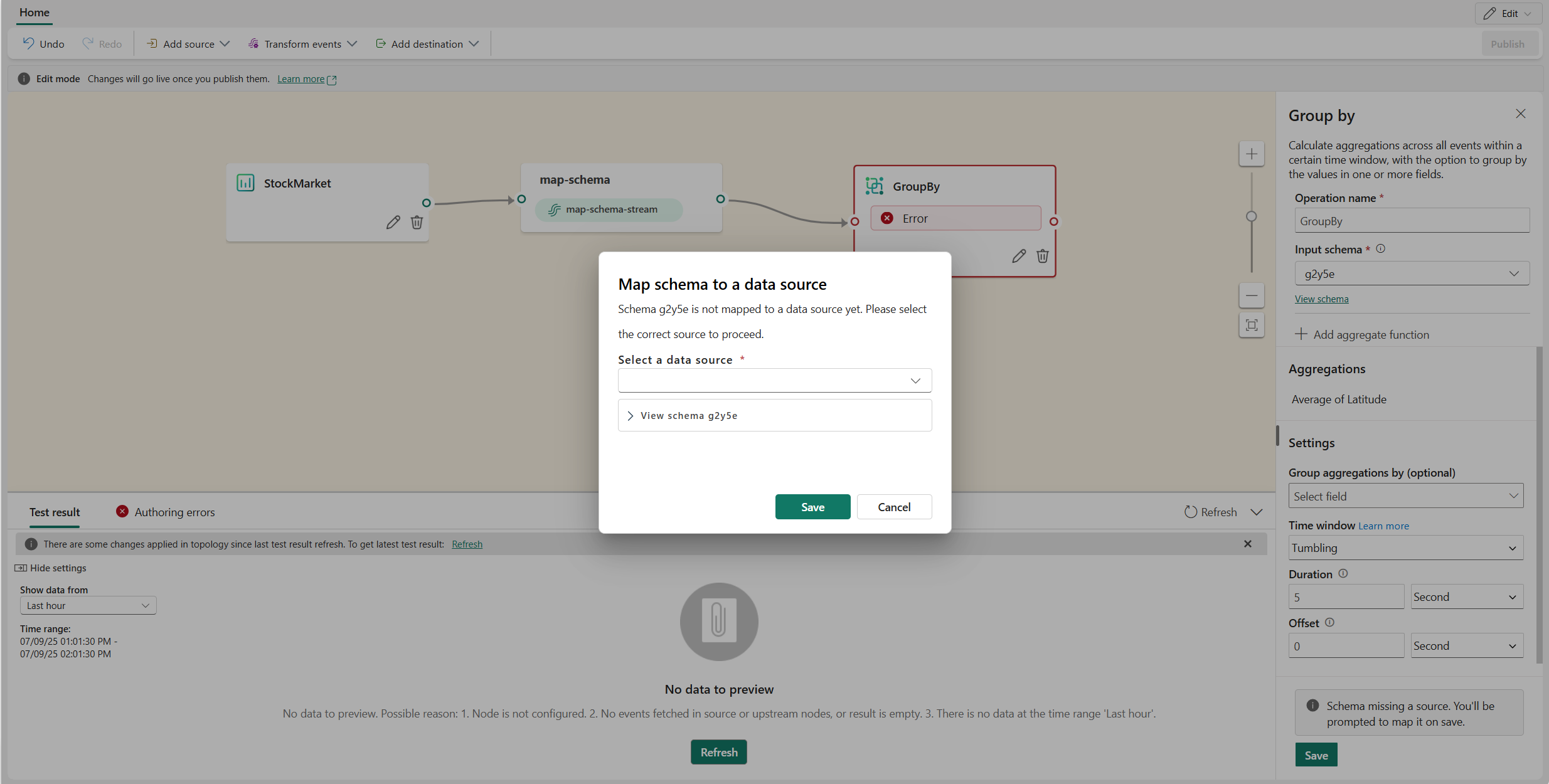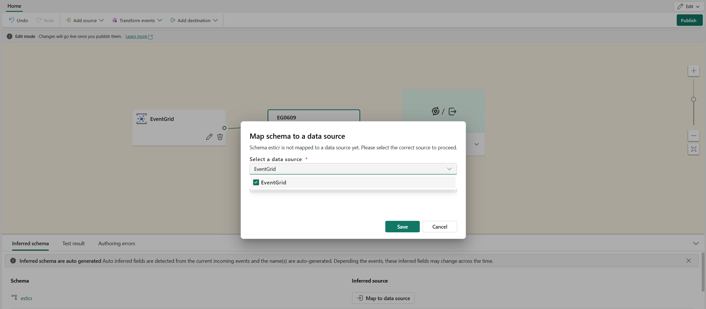 You can select an inferred schema in Edit mode to view the test result if the source supports data preview, or if it doesn't but the eventstream is published and data flows into the default stream.