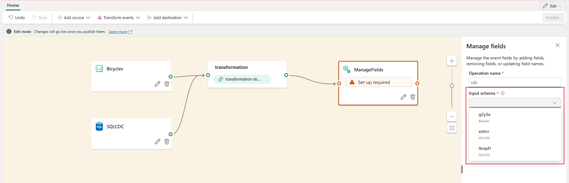 You can now continue adjusting operator configurations in transformation paths and publish the eventstream even if the newly inferred schema doesn't align with the one used in operator configurations, or if no schema is inferred upon reentry into Edit mode.