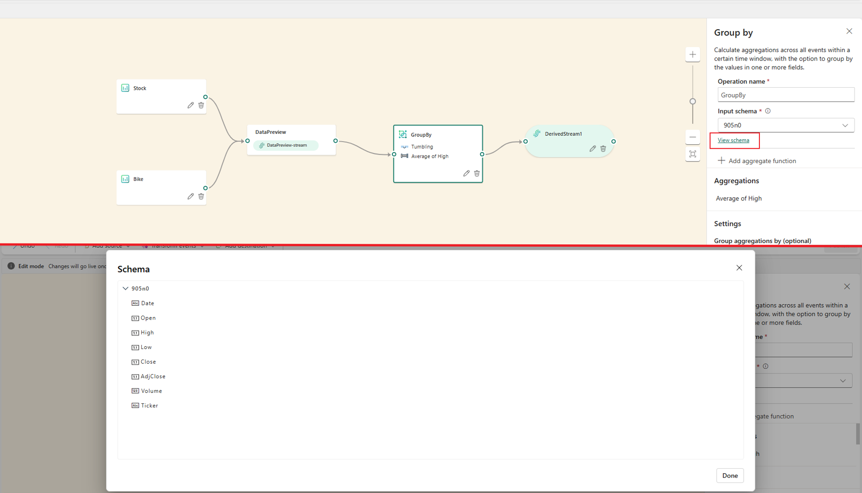 You can review and use the new schema in Edit mode. Or you can use the new schema to organize the previewed data in Live view. If your previous schema is used in an operator or destination, and the eventstream is published, your previous schema is retained and can still be viewed in Edit mode.