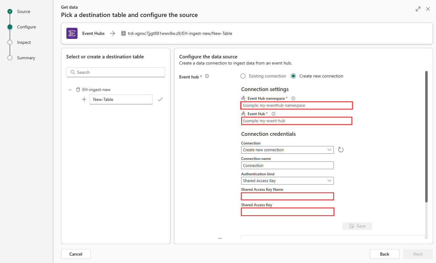 Setting Description Example value Event hub namespace Field d from the table above. eventhubpm15910.servicebus.windows.net Event hub Field a from the table above. The name of the event hub instance. iotdata Connection To use an existing cloud connection between Fabric and Event Hubs, select the name of this connection. Otherwise, select Create new connection. Create new connection Connection name The name of your new cloud connection. This name is autogenerated, but can be overwritten. Must be unique within the Fabric tenant. Connection Authentication kind Autopopulated. Currently only Shared Access Key is supported. Shared Access Key Shared Access Key Name Field b from the table above. The name you gave to the shared access policy. DocsTest Shared Access Key Field c from the table above. The primary key of the SAS policy. Select Save. A new cloud data connection between Fabric and Event Hubs is created.