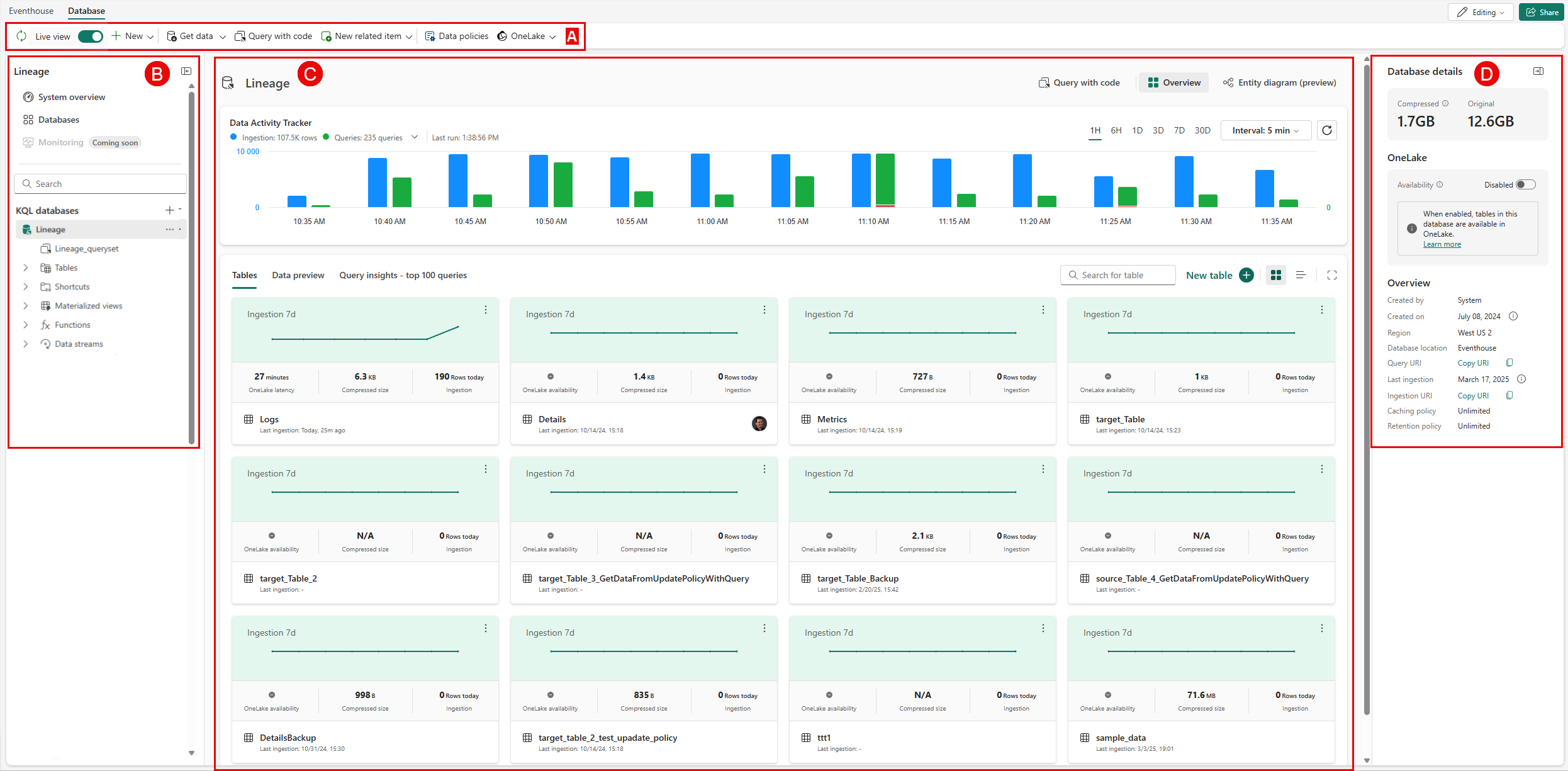 | Tables | View table information as Cards or as a List. Cards and lists view table name, Compressed size, Last ingestion, and OneLake availability or latency. * Cards uniquely display a histogram of the database ingestion over the past seven days, the number of rows ingested in the last ingestion, and the table creator profile. * The list view display also shows total Row count, Original size, Compressed size, Last ingestion, Caching, Retention, OneLake status, and Created on. To explore a specific table, select the name of this table from the list. For more information, see Manage and monitor a table. |
