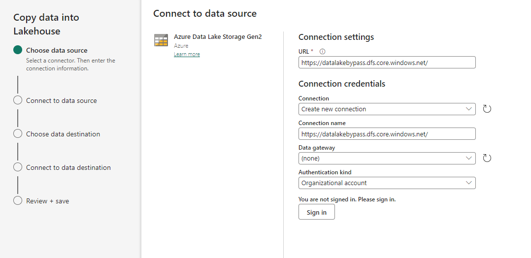 - Under cloud connections, select a data connection for the ADLS Gen2 storage account (this connection can have workspace identity, service principal, and organizational account as the authentication method)