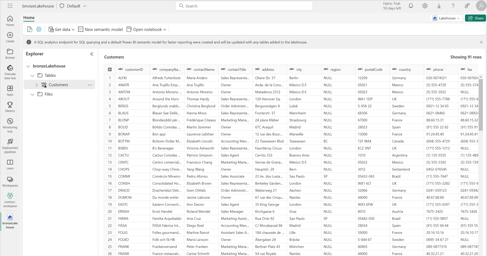 When the pipeline status changes from Queued to Succeeded, go to the lakehouse and verify that the data tables were created.