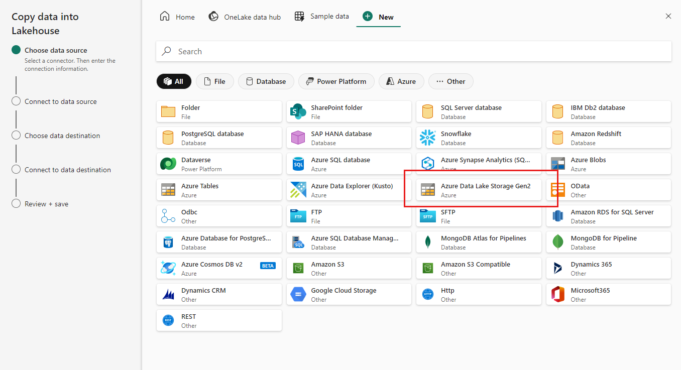 Under External sources select Azure Data Lake Storage Gen2.