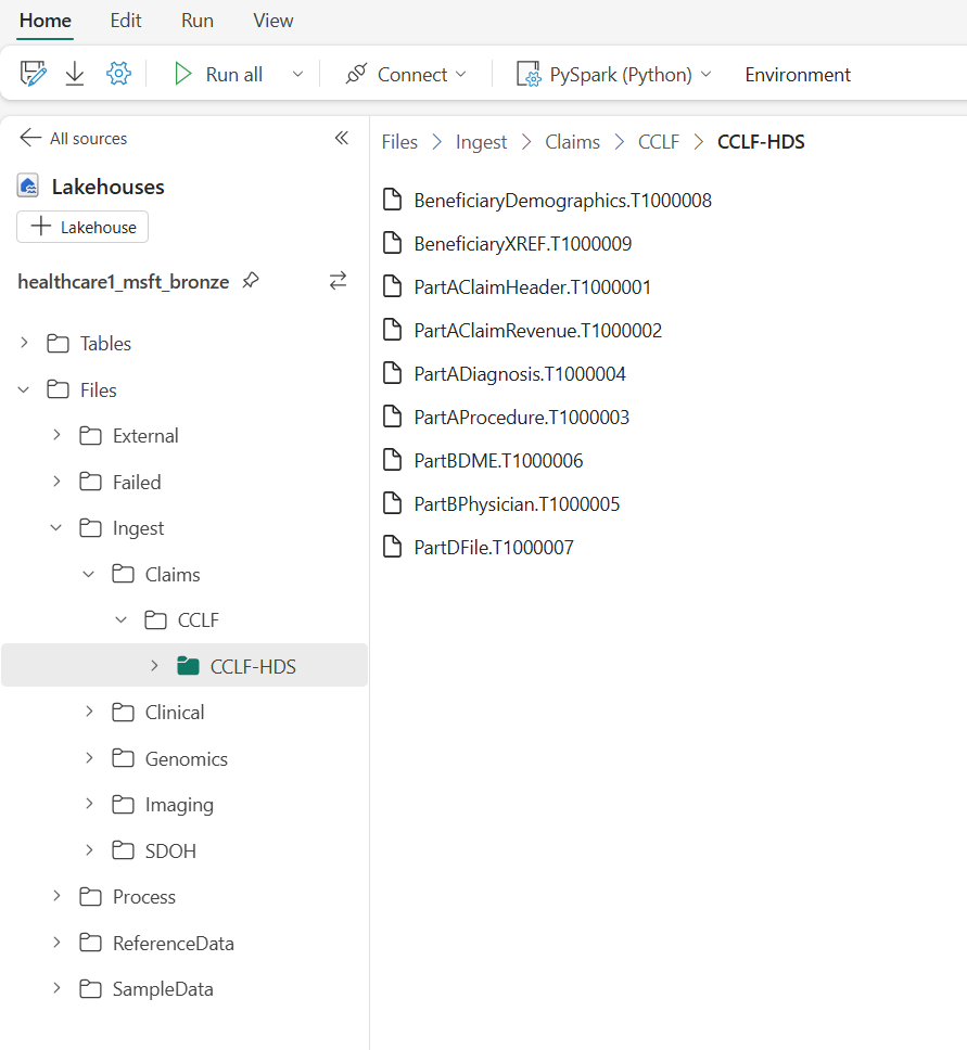 source_path = f"abfss://<workspace_name>@onelake.dfs.fabric.microsoft.com/<bronze_lakehouse_name>/Files/SampleData/Claims/CCLF/CCLF-HDS/8KCCLFClaims" target_path = f"abfss://<workspace_name>@onelake.dfs.fabric.microsoft.com/<bronze_lakehouse_name>/Files/Ingest/Claims/CCLF/CCLF-HDS" files = mssparkutils.fs.ls(source_path) for file_info in files: if file_info.isFile: source_file_path = file_info.path file_name = source_file_path.split("/")[-1] target_file_path = f"{target_path}/{file_name}" try: mssparkutils.fs.cp(source_file_path, target_file_path) print(f"Copied: {source_file_path} to {target_file_path}") except Exception as e: print(f"Error copying {source_file_path}: {e}")Run the notebook. The sample claims datasets now move to the designated location within the folder.