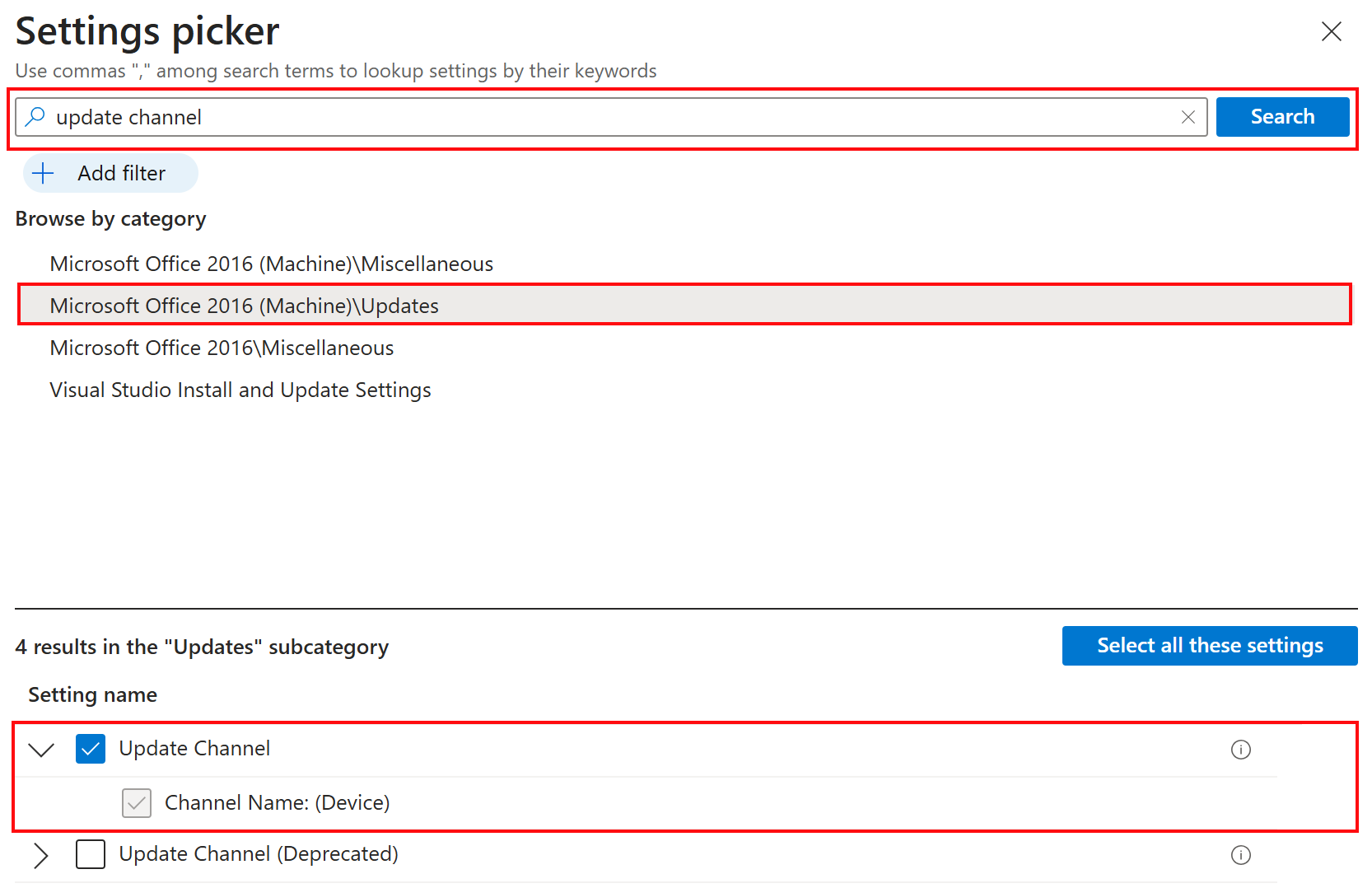 In your settings catalog policy, search for Update Channel, and select it. Close the settings picker.
