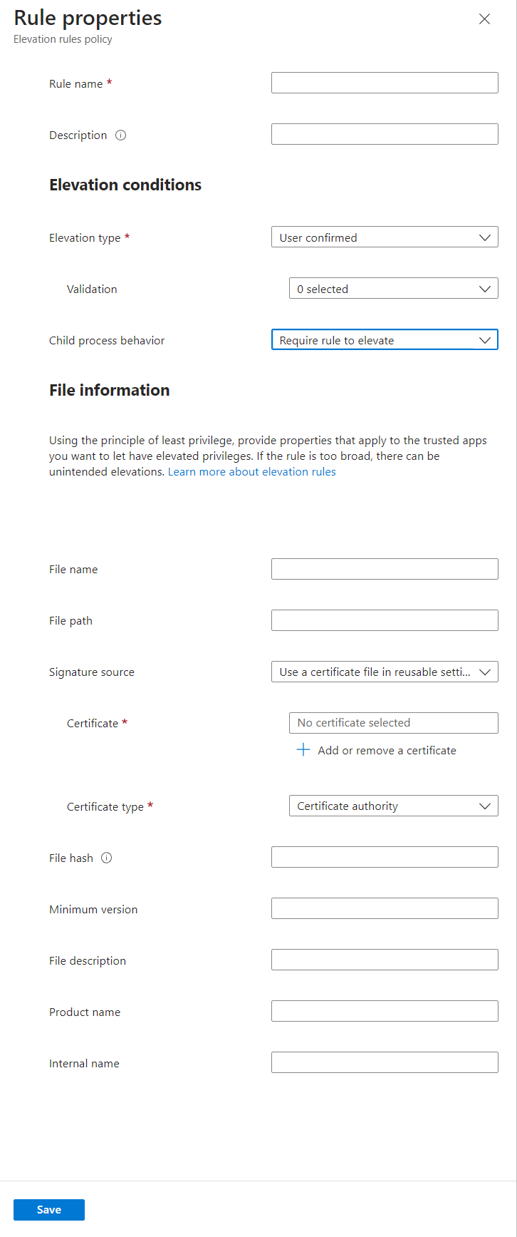 On Configuration settings, add a rule for each file that this policy manages. When you create a new policy, the policy starts includes a blank rule with an elevation type of User confirmed and no rule name. Start by configuring this rule, and later you can select Add to add more rules to this policy. Each new rule you add has an elevation type of User confirmed, which can be changed when you configure the rule.