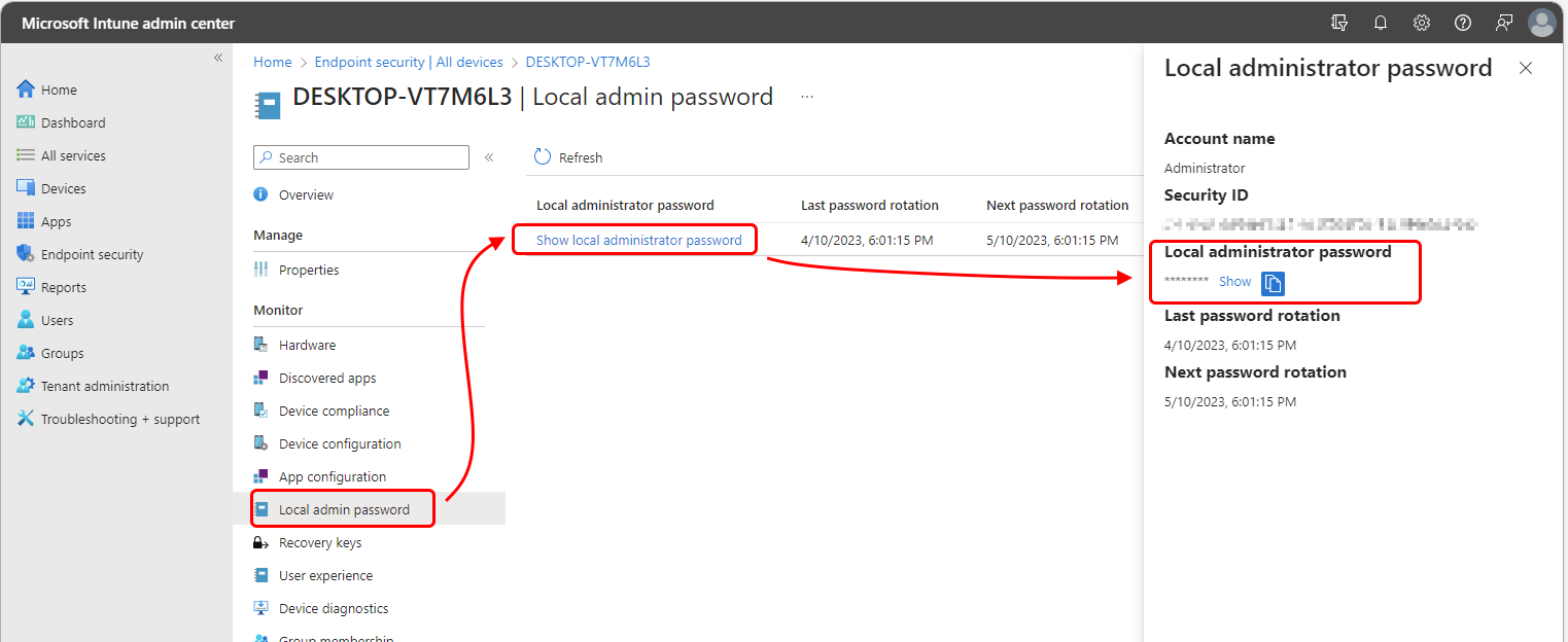 - Local admin password – Obscured by default. If your account has permission, you can select Show to reveal the password. You can then use the Copy option to copy the password to your clipboard. This information isn't available for devices that back up to an on-premises Active Directory.