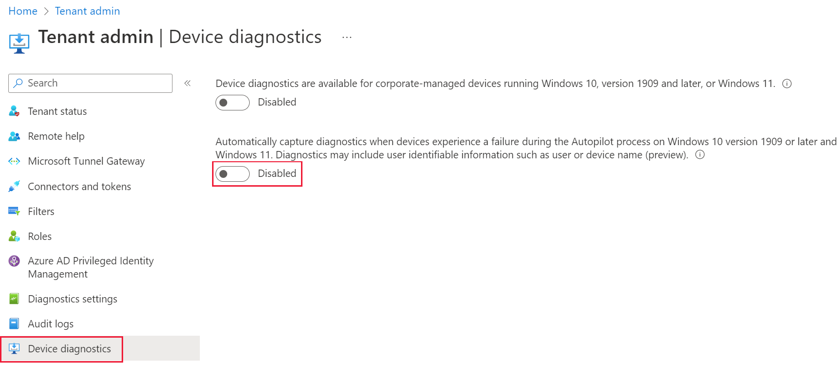 - Navigate to Tenant administration > Device diagnostics > Make sure the third setting is enabled.