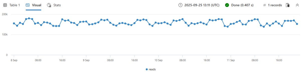 In under two minutes, the query analyzes nearly 20,000 time series and detects two with a sudden read count drop.