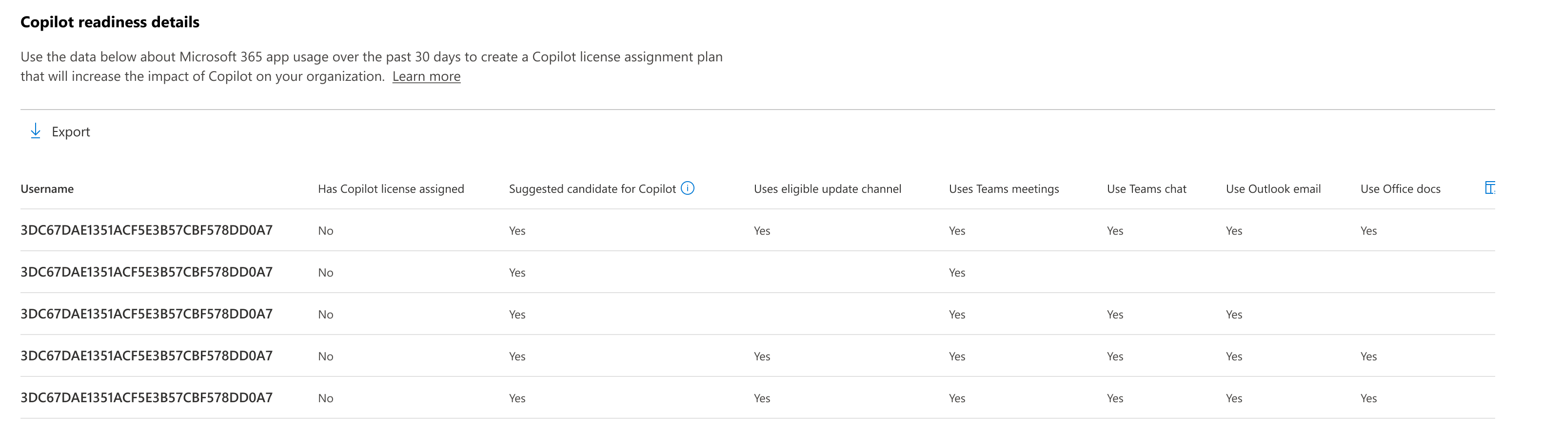 • To support interpretability, several of the inputs to the suggestion model are also shown in the Copilot readiness details table. Users that actively used Teams meetings, Teams chats, Outlook emails, or Office docs over the preceding 28 day period will have a "Yes" value in the columns corresponding with each of these applications.