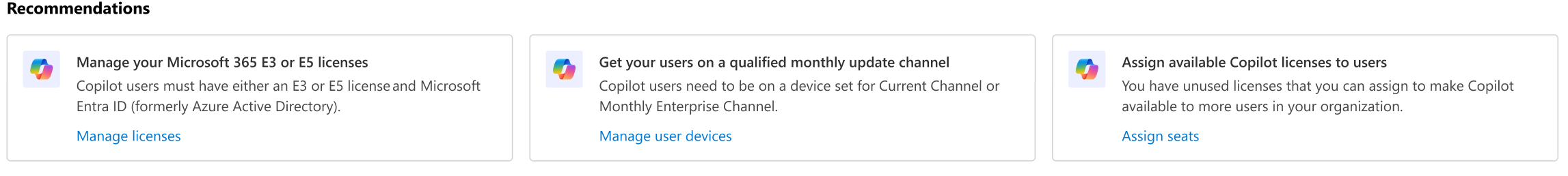 Recommended action cards highlight important actions to take to prepare your organization for Copilot, such as moving users to a monthly app update channel and assigning available Copilot licenses.