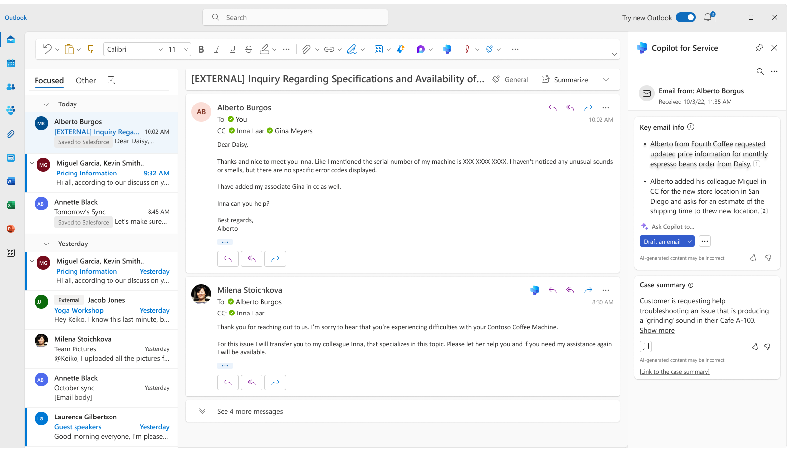 Microsoft 365 Copilot for Service generates case summaries in Outlook to help you quickly understand the context of a case and resolve customer issues more efficiently. The summary includes key information about the case, such as the customer, product, problem statement, and any notes that are linked to the case.