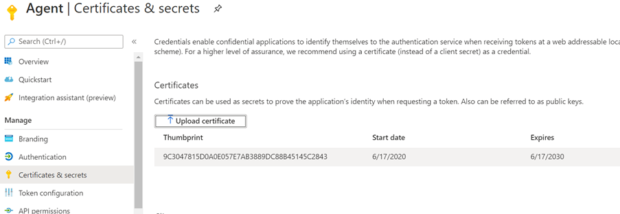 Open App registration and select Certificates and secrets. Copy the certificate thumbprint.
