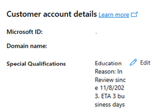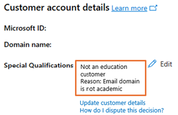 Customers who don't meet Microsoft's educational licensing requirements can be denied education qualification. A denial reason will be provided in the Customer account details section. If you believe qualification denial to be in error, you can dispute the review up to three times for a customer. Special qualification review exceeding three attempts isn't allowed.